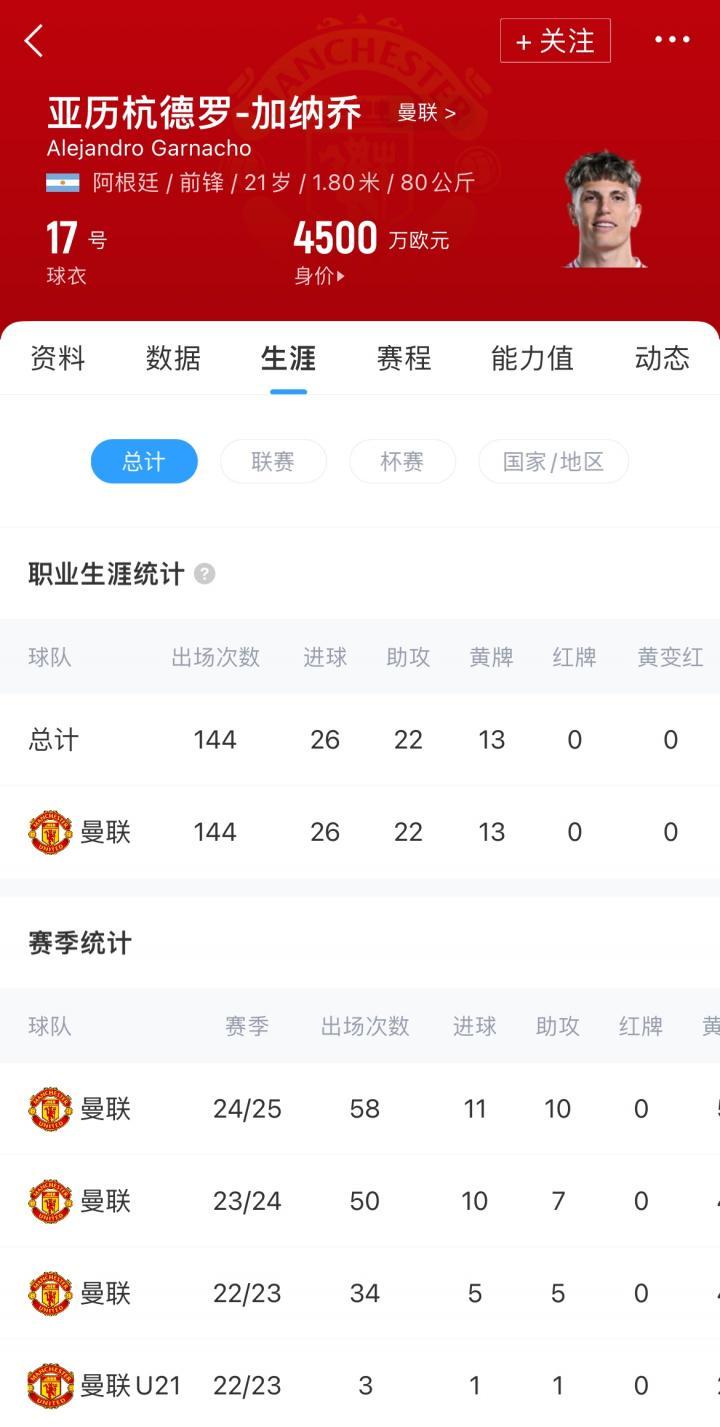 加纳乔现年21岁,阿根廷边锋,现德转估值为4500万欧。上赛季,加纳乔为曼联出场58场,取得11粒进球和10次助攻。